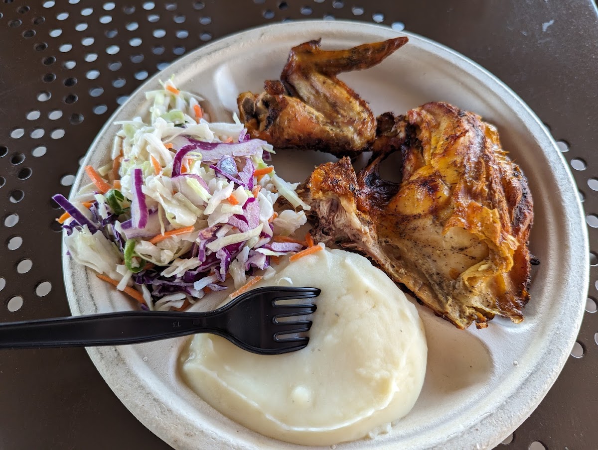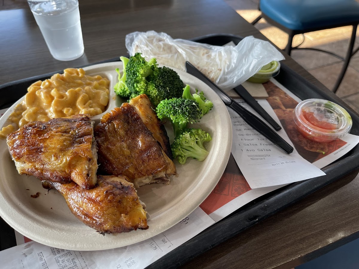 Three-Piece Chicken with Broccoli and Mac & Cheese, with flour tortillas - a hearty combo if you’re hungry.
